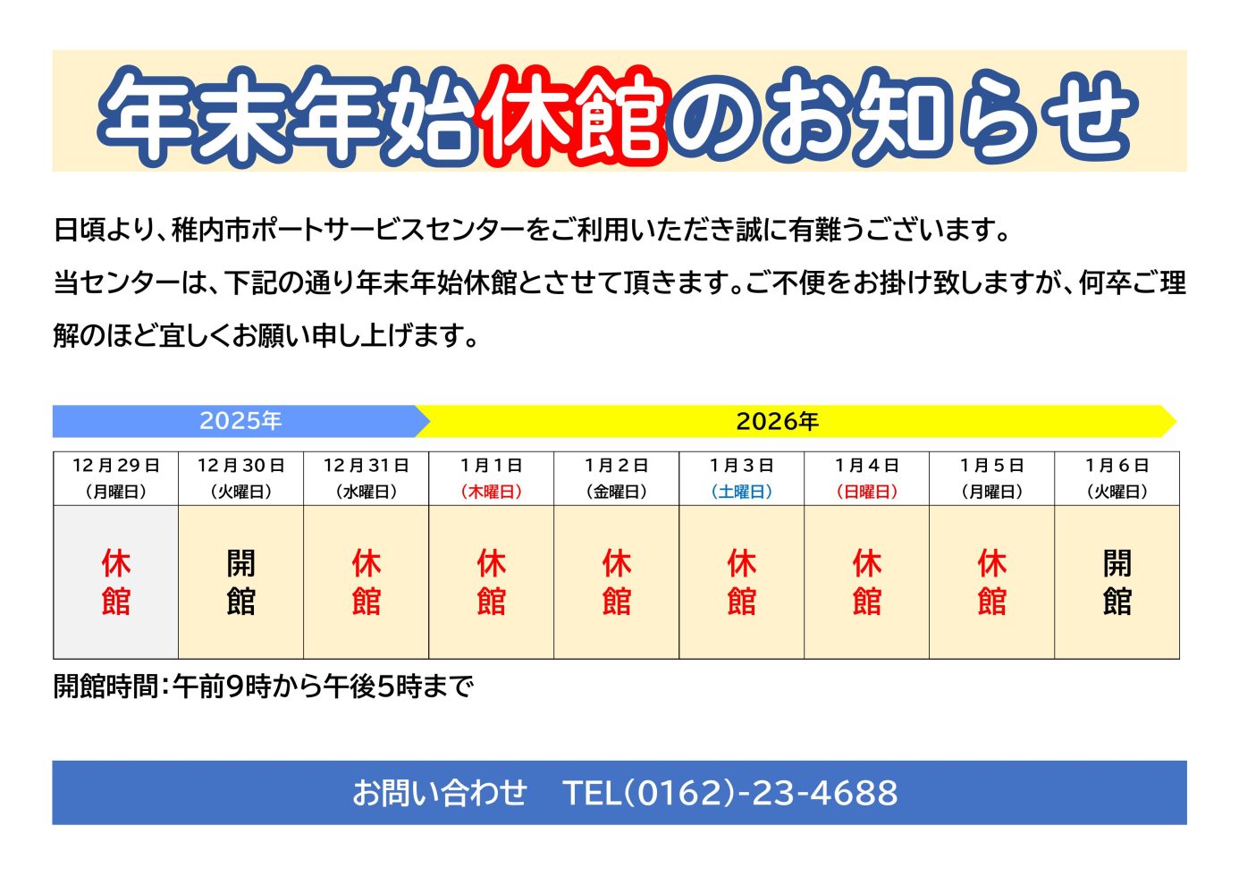 「ポートサービスセンター」の記事一覧 年末年始休館のお知らせ 2025.12.25 お知らせ 営業時間変更について(10月1日から翌6月30日まで) 2025.10.30 お知らせ 年末年始休館のお知らせ 2024.12.03 お知らせ 暴風雪による臨時休館について 2024.01.25 お知らせ 暴風雪による臨時休館について 2024.01.24 お知らせ 暴風雪、大雪による臨時休館について 2023.12.21 お知らせ 年末年始休館のお知らせ 2023.12.18 お知らせ 暴風雪に伴う臨時休館(終日)について 2023.01.25 お知らせ 暴風雪に伴う臨時休館ついて 2022.01.12 お知らせ 年末年始の休館のお知らせ 2021.12.20 お知らせ 1 / 1112345...10...»最後 » 最近の記事 2025.12.25年末年始休館のお知らせ2025.10.30営業時間変更について(10月1日から翌6月30日まで)2024.12.03年末年始休館のお知らせ2024.01.25暴風雪による臨時休館について2024.01.24暴風雪による臨時休館について 月別一覧 2025 01 02 03 04 05 06 07 08 09 10 11 12 2024 01 02 03 04 05 06 07 08 09 10 11 12 2023 01 02 03 04 05 06 07 08 09 10 11 12 2022 01 02 03 04 05 06 07 08 09 10 11 12 2021 01 02 03 04 05 06 07 08 09 10 11 12 2018 01 02 03 04 05 06 07 08 09 10 11 12 2017 01 02 03 04 05 06 07 08 09 10 11 12 2016 01 02 03 04 05 06 07 08 09 10 11 12 2015 01 02 03 04 05 06 07 08 09 10 11 12 2014 01 02 03 04 05 06 07 08 09 10 11 12 2013 01 02 03 04 05 06 07 08 09 10 11 12